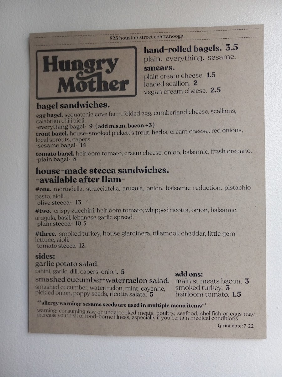 Welcome to Hungry Mother, a charming café located at 825 Houston St, Chattanooga, TN. Known for its vibrant atmosphere and welcoming service, this eatery has become a favorite for locals and travelers alike. The menu is a delightful exploration of flavors, particularly their breakfast offerings, which shine with creativity and freshness.